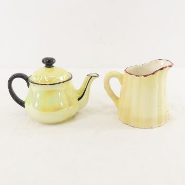 Plates, Creamers, Pyrex Casserole & More - Pyrex Casserole (large chip on lid) in Decorative Metal Holder, RKG Czech Creamer, Czech Lusterware Teapot, Edwin Knowles, Hancock & Atlas Plates & Bowl, Small Glass Decanters, Clear Glass Platters & CandleHolder. Lot Size: 20 x 15 x 8", 18 lbsPhotos are part of description, please ask questions and read terms & conditions before bidding.