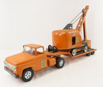 Tonka State Hi-Way Dept 975 Truck, Lowboy & Shovel - Lot Size 20x14x18" 8 LB All information and photos are intended to be as accurate as possible, but errors are possible. No item may be returned or refused based on this information, which is provided as a service to bidders. Please read terms & conditions and ask questions before bidding.