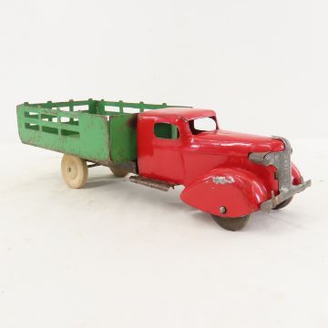 1930s Wyandotte Stake Truck - Bed is loose, front tabs are broken off. wood wheels, at least 2 are modern. Lot Size 13x5x4" 1 LB All information and photos are intended to be as accurate as possible, but errors are possible. No item may be returned or refused based on this information, which is provided as a service to bidders. Please read terms & conditions and ask questions before bidding.
