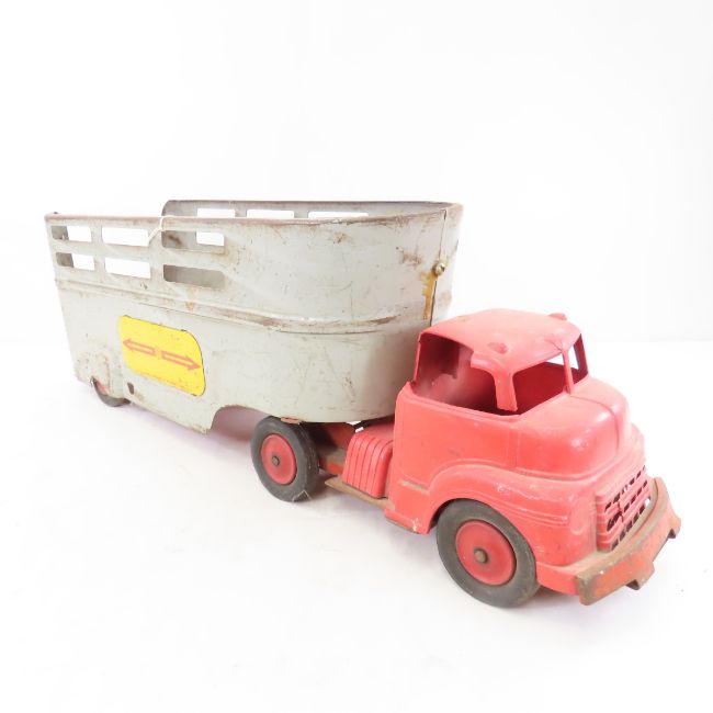 1950's Wyandotte Truck Lines Tractor Trailer - Plastic cab is badly damaged. Lot Size 18x9x12" 6 LB All information and photos are intended to be as accurate as possible, but errors are possible. No item may be returned or refused based on this information, which is provided as a service to bidders. Please read terms & conditions and ask questions before bidding.