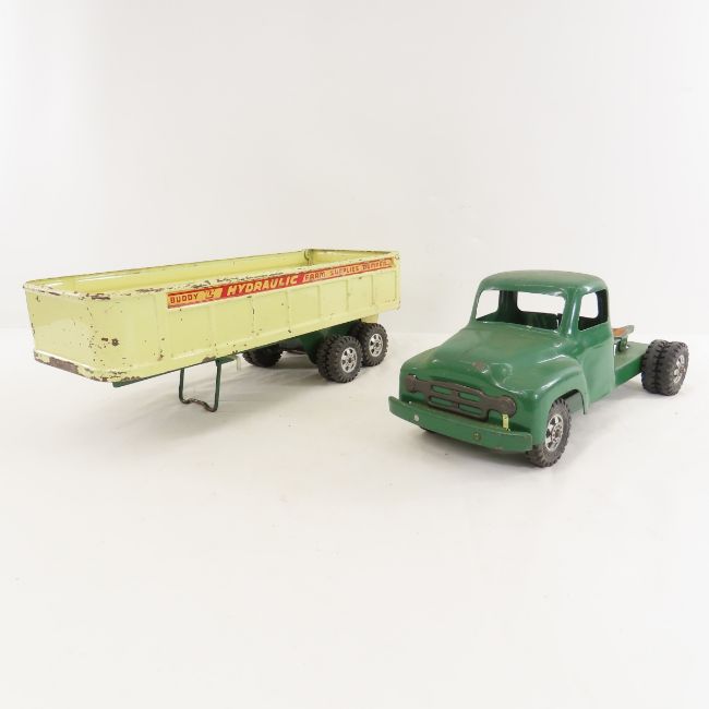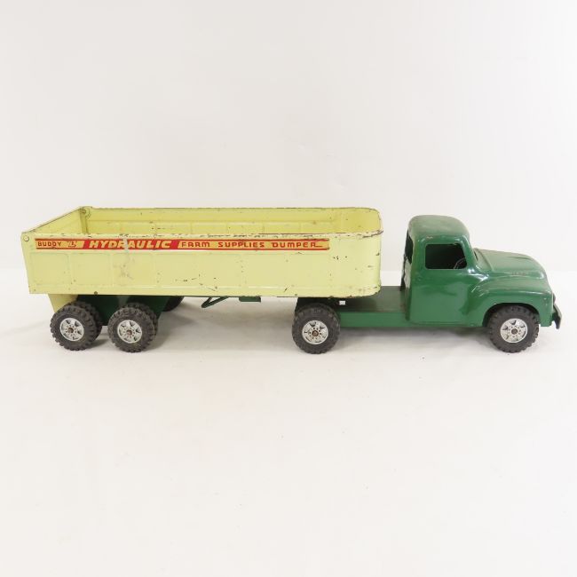 Buddy L Truck & Hydraulic Farm Supplies Dumper - Hydraulics don't work, more of a launcher now. Good Tailgate. Lot Size 18x12x6" 6 LB All information and photos are intended to be as accurate as possible, but errors are possible. No item may be returned or refused based on this information, which is provided as a service to bidders. Please read terms & conditions and ask questions before bidding.