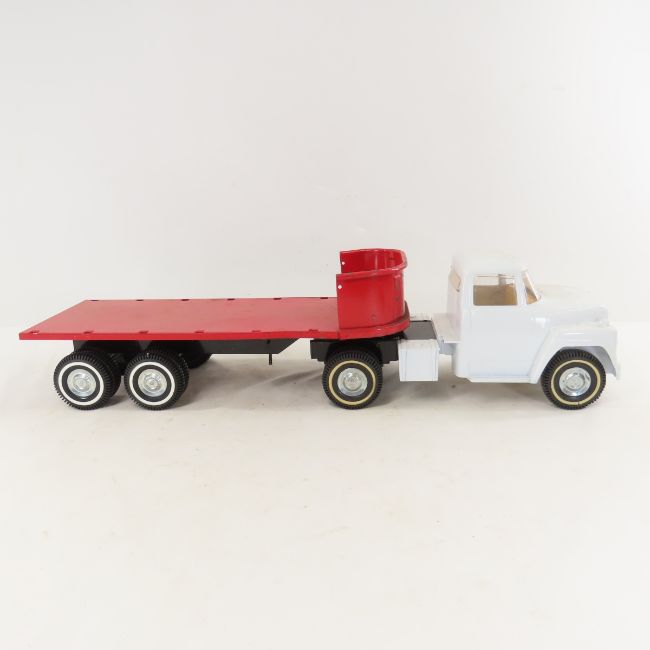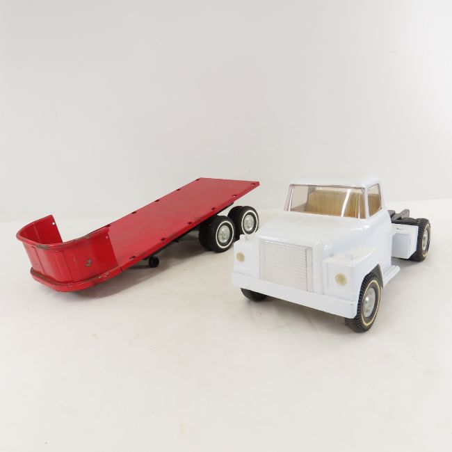 ERTL Semi Truck & Flatbed Trailer - missing stakes for trailer, repainted Truck. Lot Size 15x10x7" 4 LB All information and photos are intended to be as accurate as possible, but errors are possible. No item may be returned or refused based on this information, which is provided as a service to bidders. Please read terms & conditions and ask questions before bidding.