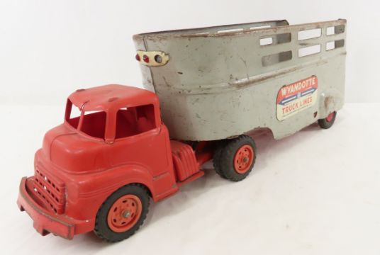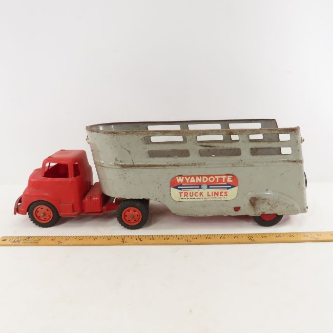 Wyandotte Truck Lines Plastic Cab & Metal Trailer - Cab is cracked. Lot size 18x12x10" 5 LB All information and photos are intended to be as accurate as possible, but errors are possible. No item may be returned or refused based on this information, which is provided as a service to bidders. Please read terms & conditions and ask questions before bidding.