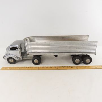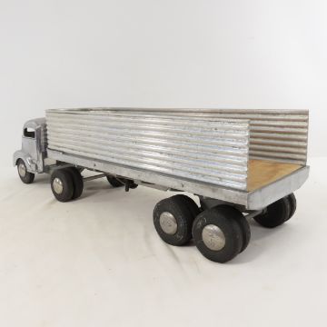 Smith Miller Smitty Toys Cab Over Truck & Trailer - no tailgate. Lot Size 18x13x7" 6 LB All information and photos are intended to be as accurate as possible, but errors are possible. No item may be returned or refused based on this information, which is provided as a service to bidders. Please read terms & conditions and ask questions before bidding.