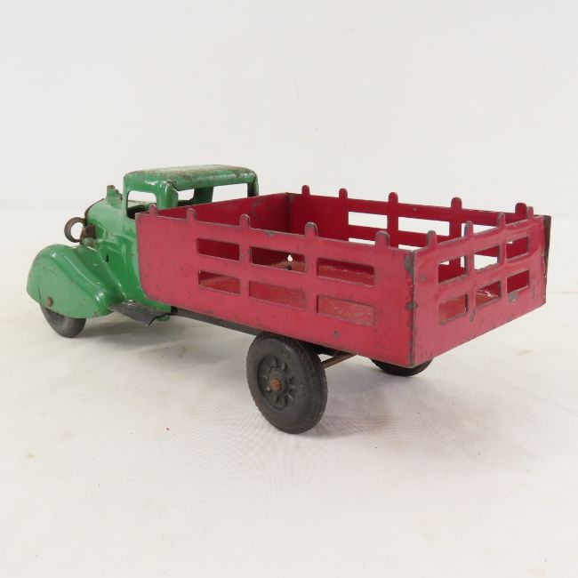 Kingsbury Pressed Steel Stake Truck - Lights don't work, much of the mechanism appears to be missing. Lot Size 10x4x4" 1 LB All information and photos are intended to be as accurate as possible, but errors are possible. No item may be returned or refused based on this information, which is provided as a service to bidders. Please read terms & conditions and ask questions before bidding.