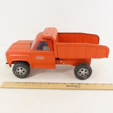 Tonka USA Orange Dump Truck - No Dump Mechanism. Lot Size 14x7x7" 3 LB All information and photos are intended to be as accurate as possible, but errors are possible. No item may be returned or refused based on this information, which is provided as a service to bidders. Please read terms & conditions and ask questions before bidding.