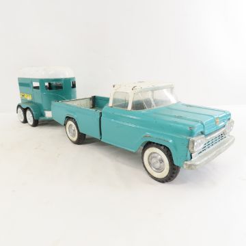 Nylint Ford Pickup Truck & Horse Trailer - Thoroughbred Farms Trailer with 3 Horses. Lot Size 15x12x7" All information and photos are intended to be as accurate as possible, but errors are possible. No item may be returned or refused based on this information, which is provided as a service to bidders. Please read terms & conditions and ask questions before bidding.