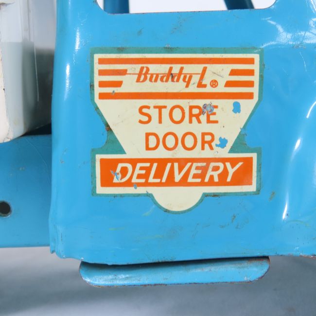 Buddy L Store Door Delivery Truck with ramp - and grocery store style roller. Ramp is marked Buddy L, no marks on roller - missing 2 rollers. Lot Size 15x6x6" 3 LB All information and photos are intended to be as accurate as possible, but errors are possible. No item may be returned or refused based on this information, which is provided as a service to bidders. Please read terms & conditions and ask questions before bidding.