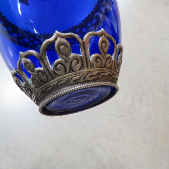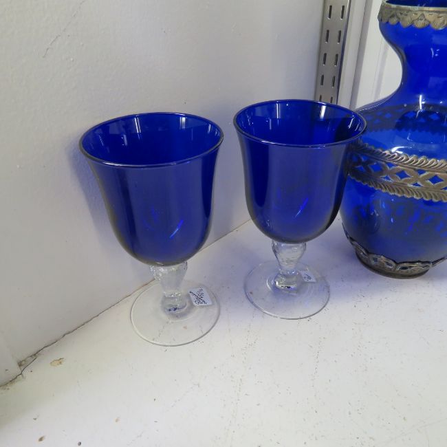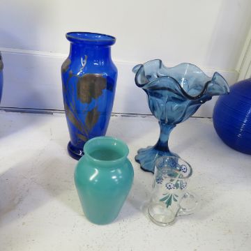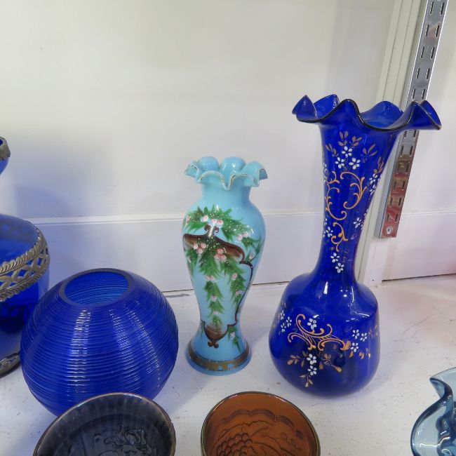Antique Hand Painted Cobalt & Other Blue Glass tallest 12" vase with ruffle edge and hand painted, 1 vase with metal edge trim, 2 iridized carnival glass cups, and more Please read terms & conditions and ask questions before bidding.