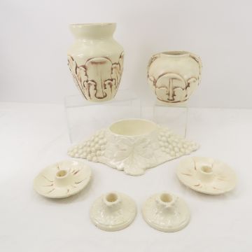 7 Assorted Rum Rill Red Wing Pieces 447 vase- hairline, 450, 433 (pair), 626, and 220 (pair) Please read terms & conditions and ask questions before bidding.