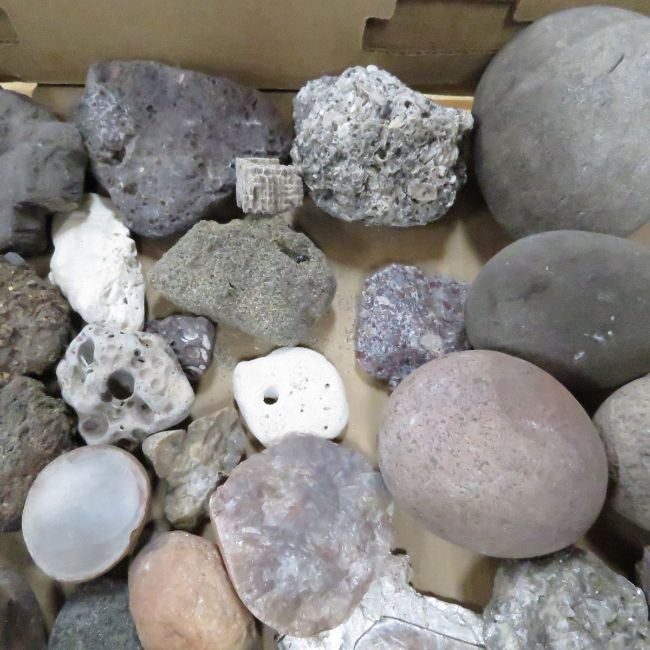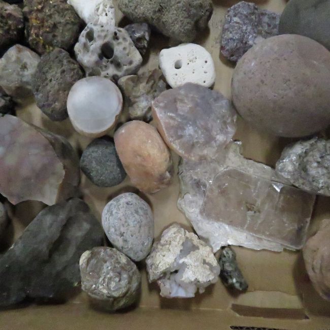 20 pounds mixed rocks, fossils, minerals some cut, some look rounded and ready to cut Please read terms & conditions and ask questions before bidding.