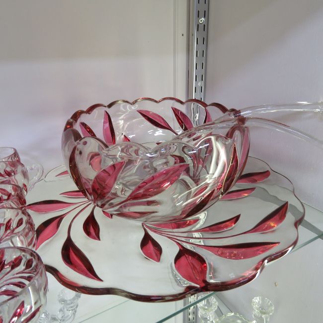 Indiana Glass 1008 Willow Red Flash Punch Bowl Set 17" plate, 10" bowl, 2 ladles & 11 cups Please read terms & conditions and ask questions before bidding.