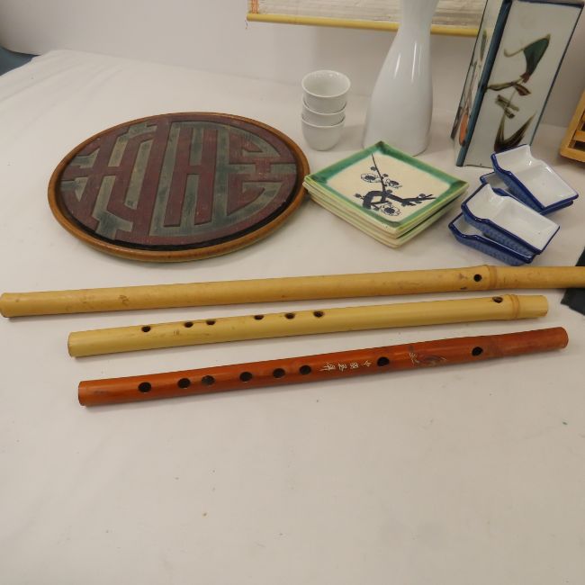 Chinese decoratives, music box, flutes & more Several sets of chopsticks, Sake set Please read terms & conditions and ask questions before bidding.