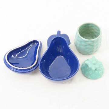 6 Red Wing Gypsy & Other Art Pottery Pieces B1422 in green, turquoise pineapple hostess set, 402 in brown, 877 in brown/yellow, B2015 in burgundy, and blue pear covered marmite Please read terms & conditions and ask questions before bidding.