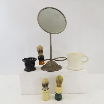 Antique Shaving Mirror, Brushes, Razor & Tins Please read terms & conditions and ask questions before bidding.