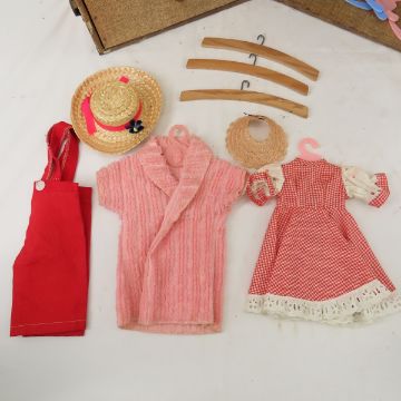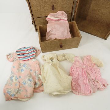 Vintage doll trunk with doll and clothes very musty Please read terms & conditions and ask questions before bidding.