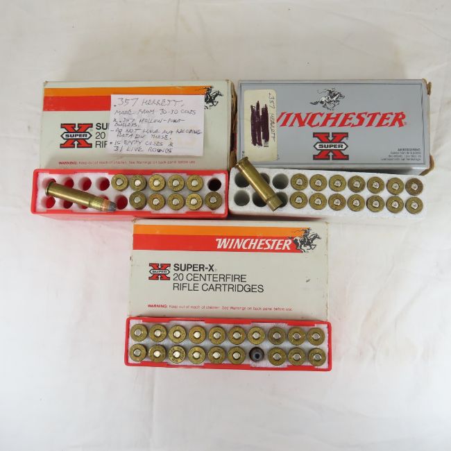 31 Rounds .357 Herrett Ammunition & 15 BrassReloaded .357 Herrett ammunition, made from resized 30-30 cases. Consists of 31 live rounds and 15 empty cases, all from a mix of manufacturers. Do not have any loading information or bullet weights. Please ask questions & read terms & conditions before bidding.