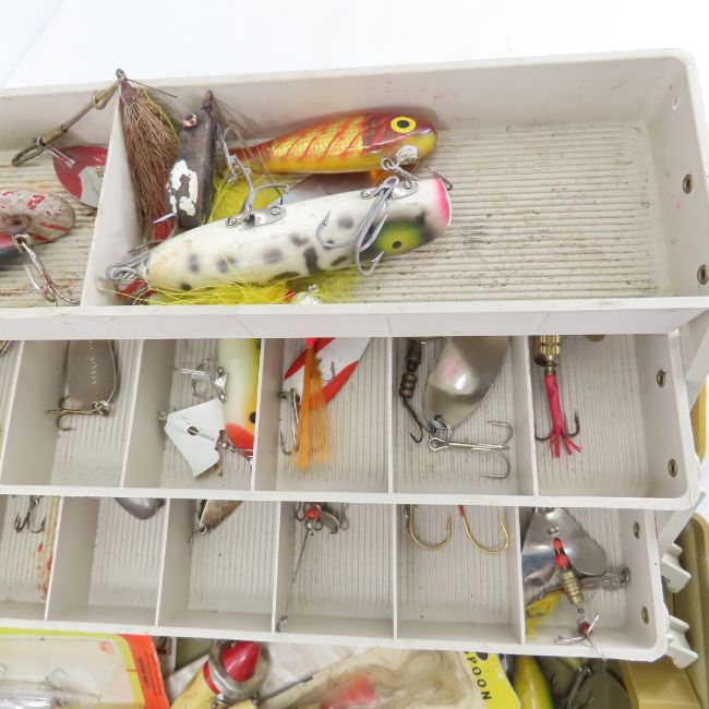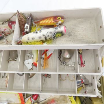 Vintage tackle box with lures and gearCanadian Bait Co, Martin, South Bend, Heddon, KB, lots of metal, wood & plastic lures Please ask questions & read terms & conditions before bidding.