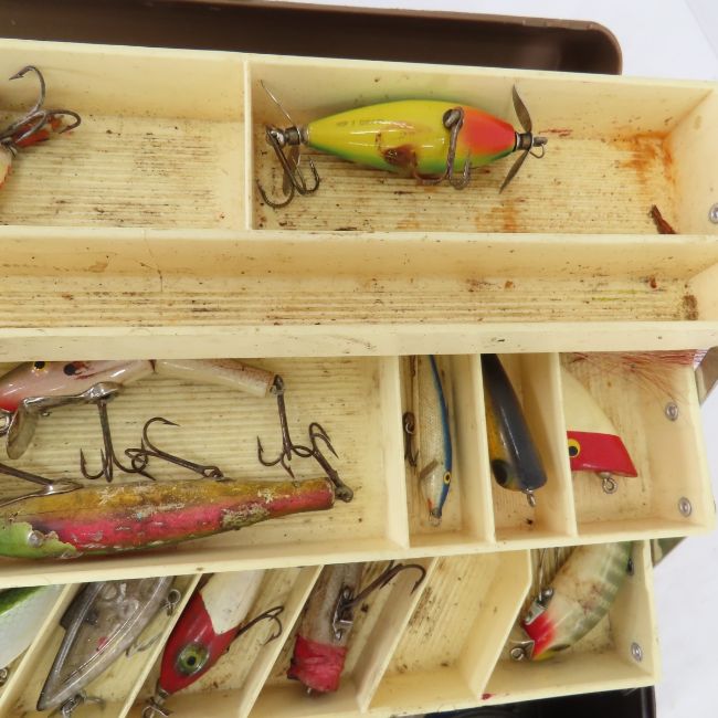 Vintage tackle box with lures and gearCreek Chub, Sure Strike, Lazy Ike, reels, terminal tackle & more Please ask questions & read terms & conditions before bidding.