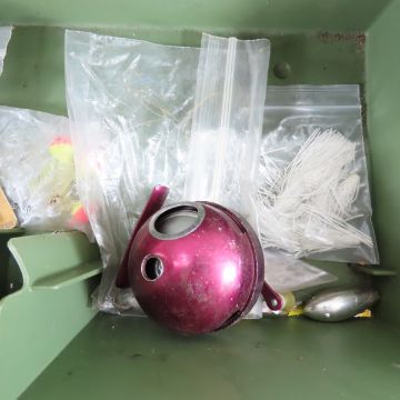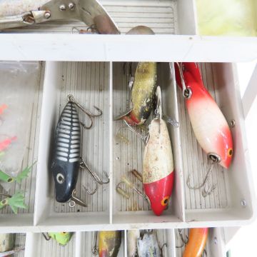 Vintage tackle box with lures and gearReal Frog, Bomber, Heddon, South Bend, Bagley?, 3 reels, split's bottle lures, & many more Please ask questions & read terms & conditions before bidding.