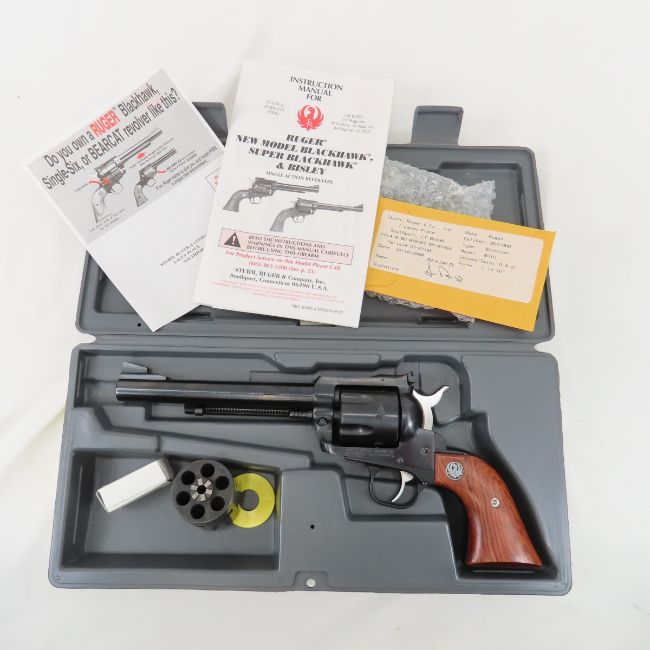 Ruger New Model 318 Blackhawk .357/9mm Revolver6 1/2" barrel, front & rear sights, 6 shot, wood grips with Ruger logo inlay, both 357 mag & 9mm cylinders, SN# 37-67186, in original plastic case with papers and lock. FFL transfer required. Please ask questions & read terms & conditions before bidding.