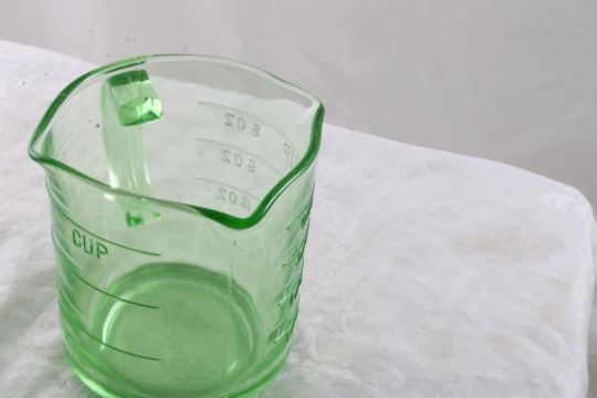 1930's Kellogg's Uranium Glass Measuring Cup1 Cup Size with 3 Spouts and glows under black light as pictured. Please ask questins and read terms & conditions before bidding.