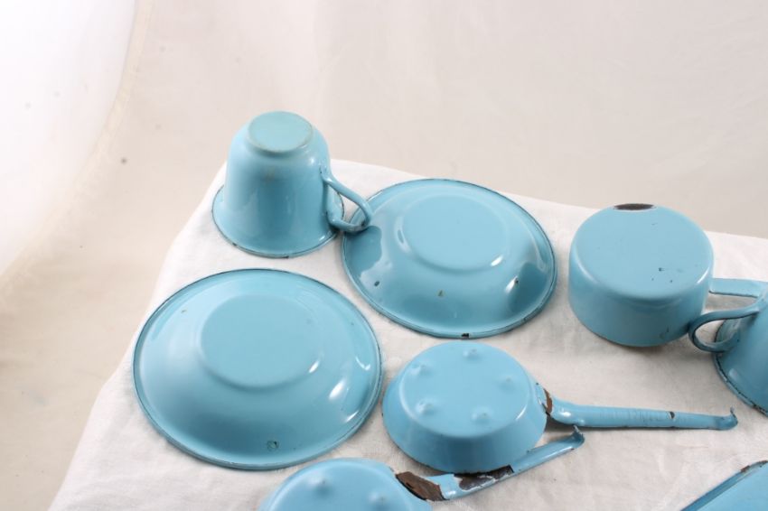 8 Piece Blue Enamelware Child's Kitchen WareRobins Egg Blue as pictured. Please ask questins and read terms & conditions before bidding.