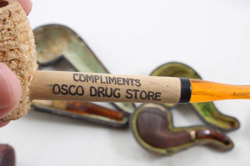 WDC Bakelite Pipe & Other Pipes, Parts & CasesFrench Briar Bakelite with Case, WDC 14kt Gold Plate, Corn Cob Pipe Osco Drug Store Advertising & more as pictured. Please ask questins and read terms & conditions before bidding.