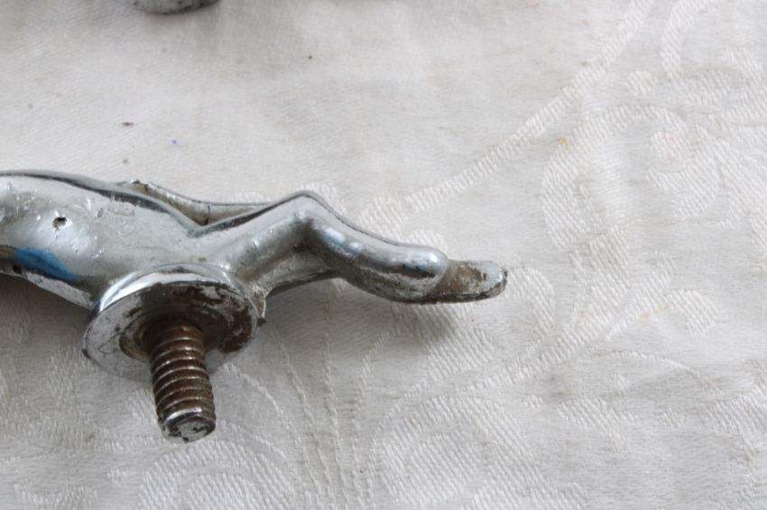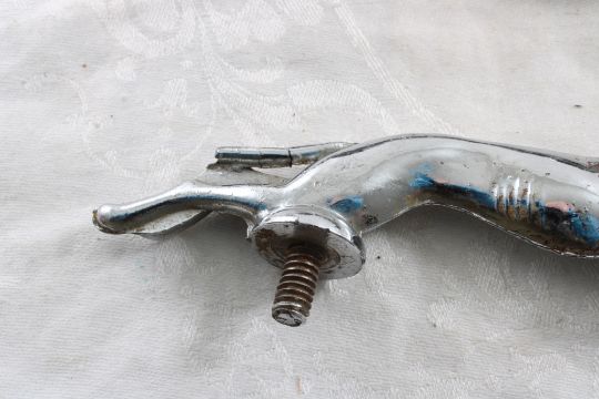 2 Grehound Whippet Hood Ornaments 5 1/4" LongOne of them has the screw broken off as pictured. Please ask questins and read terms & conditions before bidding.