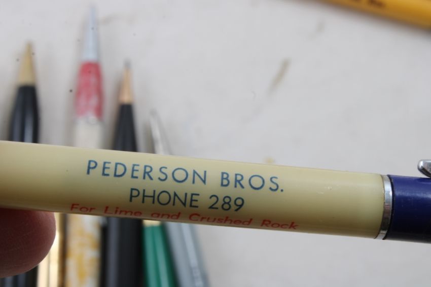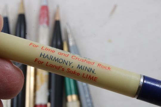 Advertising Mechanical Pencil LotTwin Lakes, Minn Hardware, Hemenway Concrete Albert Lea, Minn. Kalke Cement Block & Tile New Richland, Minn., Mason Bros. Wadena, Minn., 1944 Calendar Pencil Cedar Falls, Iowa, and others as pictured. Please ask questins and read terms & conditions before bidding.