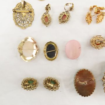 Cameo style and other costume jewelry rosary, comfee earring adjusters, Girl Scout pins Please ask questions and read terms & conditions before bidding.