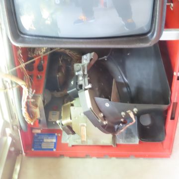 Vintage 25 cent slot machine, works with key, 42x18x20" top crown part is broken Please ask questions and read terms & conditions before bidding.