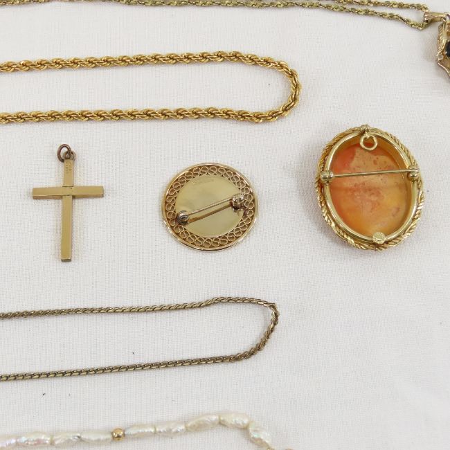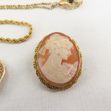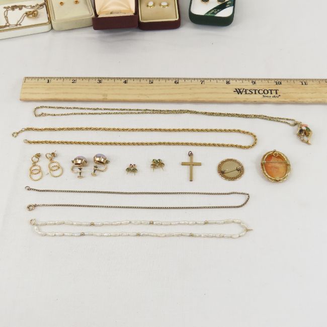 Vintage gold and gold filled jewelry, cameo one pair 14k gold topaz stud earrings gold filled earrings, necklaces, pins, etc. Please ask questions and read terms & conditions before bidding.
