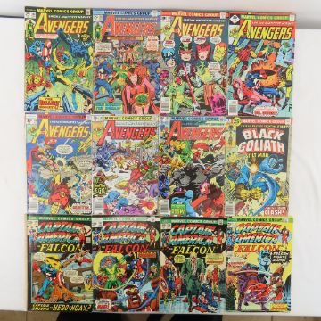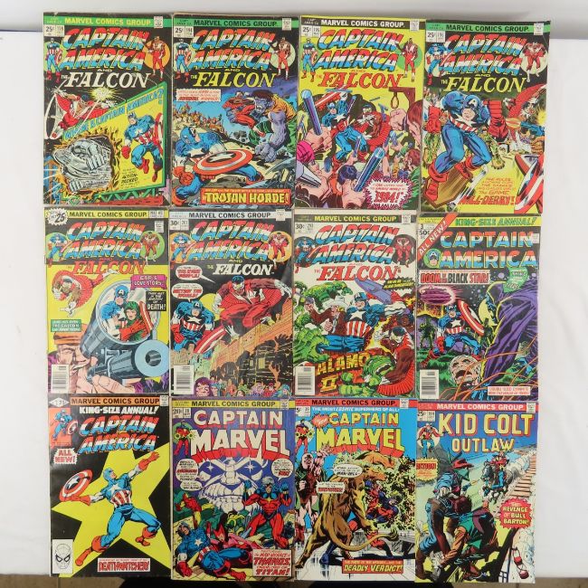 84 Marvel Super Hero comics from 1956-1981 -Avengers (1964) 5; Amazing Adventures (starring Beast) 13, 19-20; Astonishing Tales 4; Avengers 106, 113, 127, 134, 136-137, 139, 144, 147, 154, 156, 159, 182, 188, Black Goliath 4; Captain America 126, 153,172, 176-178, 194-196, 198, 201, 203, Annual 3, 5; Captain Marvel 28, 39, 62; Captain Savage 13; The Cat 4; Creatures on The Loose 26; Daredevil 35, Doctor Strange 8, 13; Fantastic Four 191-192, 201; Frankenstein 1, 4; Giant-Size Invaders 1, Giant-Size Master of Kung Fu 1; Incredible Hulk 109, 127, 134, 158; Iron Man 23, 132-134; Kid Colt Outlaw 147, 199, 216, 226; Marvel Premiere (starring Solomon Kane) 33; Marvel Adventure (featuring Daredevil) 1; Marvel Feature (starring Red Sonja and Conan) 7; Mighty Marvel Western (starring Rawhide Kid) 26, 29; Power Man 27; Rawhide Kid 125, 128, 139, 142, 144; Ringo Kid 14 - Note this is a 10-cent Atlas Comic (Marvel's predecessor) from 1956; Sgt. Fury 79; Shogun Warriors 14; Spider-Woman 11; Sub-Mariner 37, 45; Two-Gun Kid 135; Vault of Evil 21; Weird Wonder Tales 20; Werewolf by Night 1, 43; Wyatt Earp 30, 34. Cover prices are: 12 cents = 4, 15 cents = 8, 20 cents = 17, 25 cents = 24, 30 cents = 12, 35 cents = 8, 40 cents = 6, 50 cents = 4, 75 cents = 1.. Please ask questions and read terms & conditions before bidding.