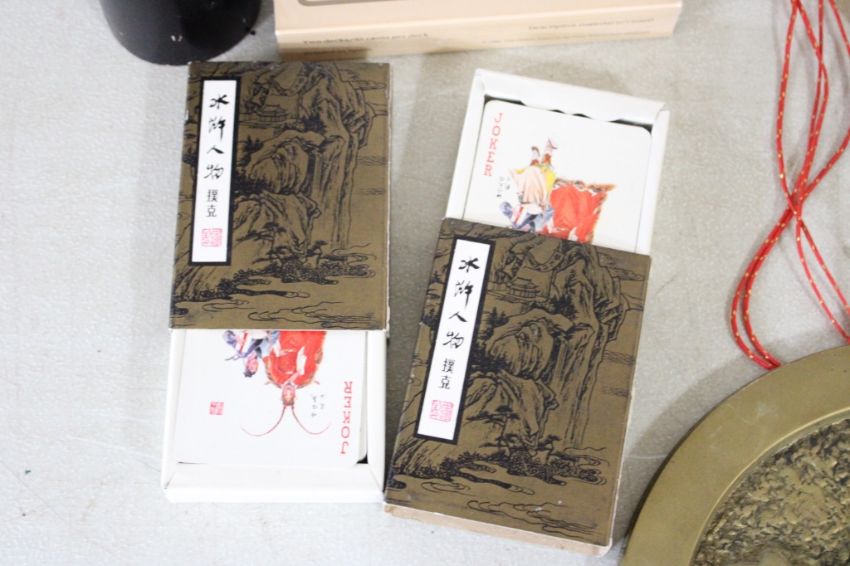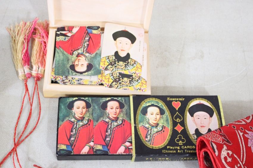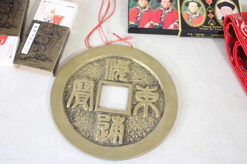 Oriental Playing Cards, Fortune Telling Game, More -Brass Feng Shui Lucky Fortune Coin Wall Hanging, Cards are Chinese Art Treasures & others, Embroidered Chinese Lantern Fish Table runner all as pictured. Please ask questions and read terms & conditions before bidding.