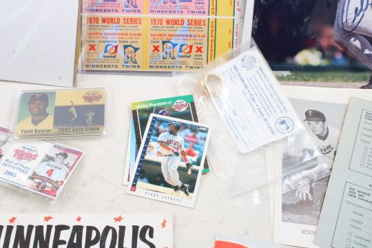 Vintage Minnesota Twins Collectibles -200 Twins Baseball Cards, Homer Hanky 1987, Signed Kirby Puckett Photo, 1970 World Series Minnesota Twins 4 Tickets, Minnesota Twins Baseball Club Stationary, Twins Souvenir Ring New in Package, 2 Pinbacks 3.5" diameter 1is 1987 Twins Champions, Torii Hunter 2002 Gold Glove Card, Bob Casey & Bob Allison 2003 Hall of Fame Inductees Enamel Pins New in Package, 12 5" x 7" B&W Photo cards of Minnesota Twins Players Harmon Killewbrew,Earl Battey, Bob Allison, Jim Lemon, Jim Kaat, Zorro Versalles & More, 2 Invoice Clips, Matchbook Front Strike Unused, 1966 Medallion Twins Pennant, 1987 World Series Lapel Pin 10 Kirby Puckett Baseball CardsPLUS 2 Minneapolis Millers 1953 & 1958 Baseball Programs all as pictured. Please ask questions and read terms & conditions before bidding.