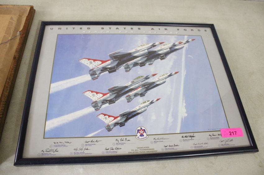 Victorian Framed Needlework, USAF Thunderbirds -U.S. Air Force Thunderbirds framed Print 25" x 19" with facsimile signatures of the Thunderbirds & Victorian Framed Needlework with celluloid Cherub in the center that measures 17 1/2" x 22 1/2" Antique Frame both as pictured. Please ask questions and read terms & conditions before bidding.