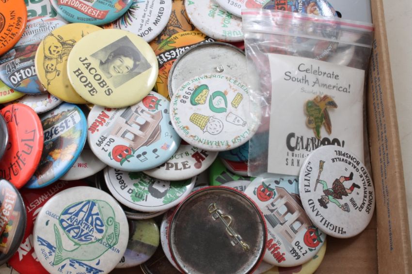 Large Lot Vintage Pinback Buttons -As pictured. Please ask questions and read terms & conditions before bidding.