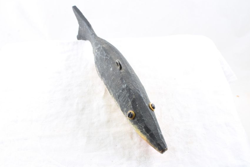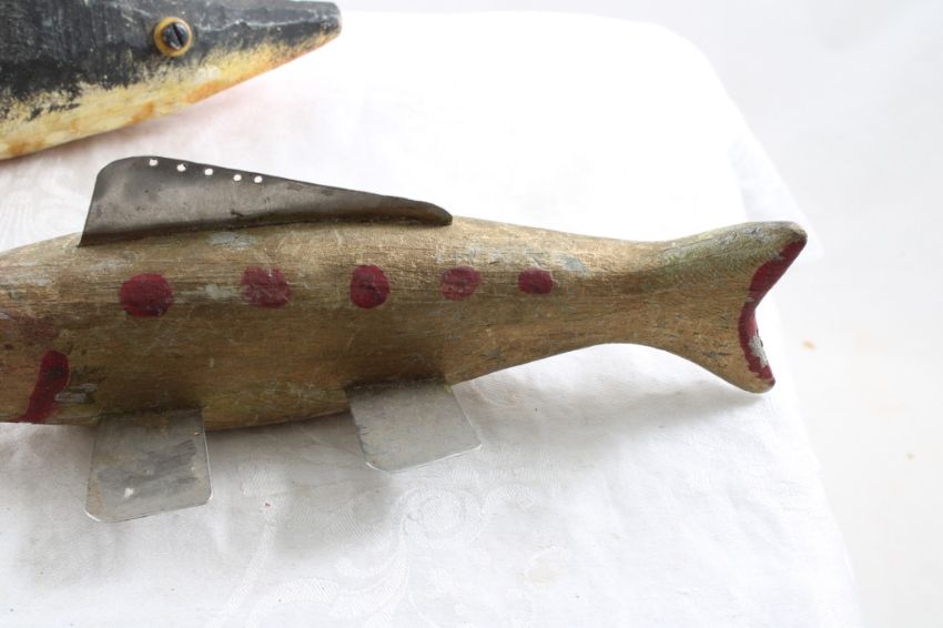 2 Folk Art Carved Wooden Spearing Fish Decoys -Measure 8 1/4" and 10 1/4" Long as pictured. Please ask questions and read terms & conditions before bidding.