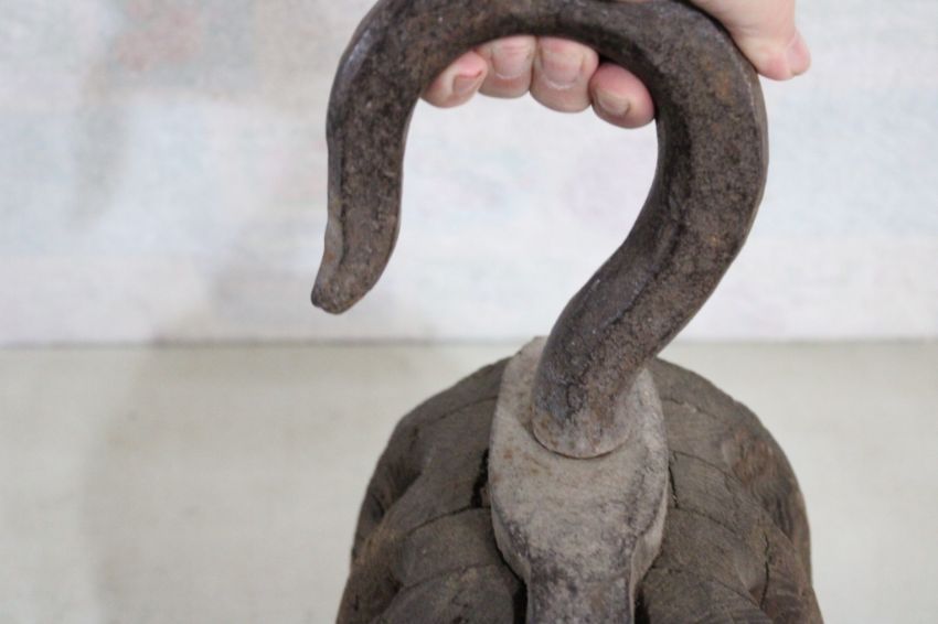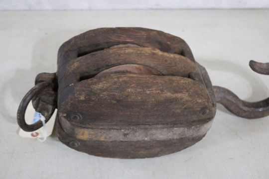 Old Nautical Block & Tackle Wood Double Pulley -Measures 8" x 6" x 10 1/2" with large hook that measures 6 1/2" And Total length is 21 1/2" from end of hook to metal ring. Please ask questions and read terms & conditions before bidding.