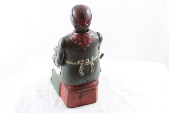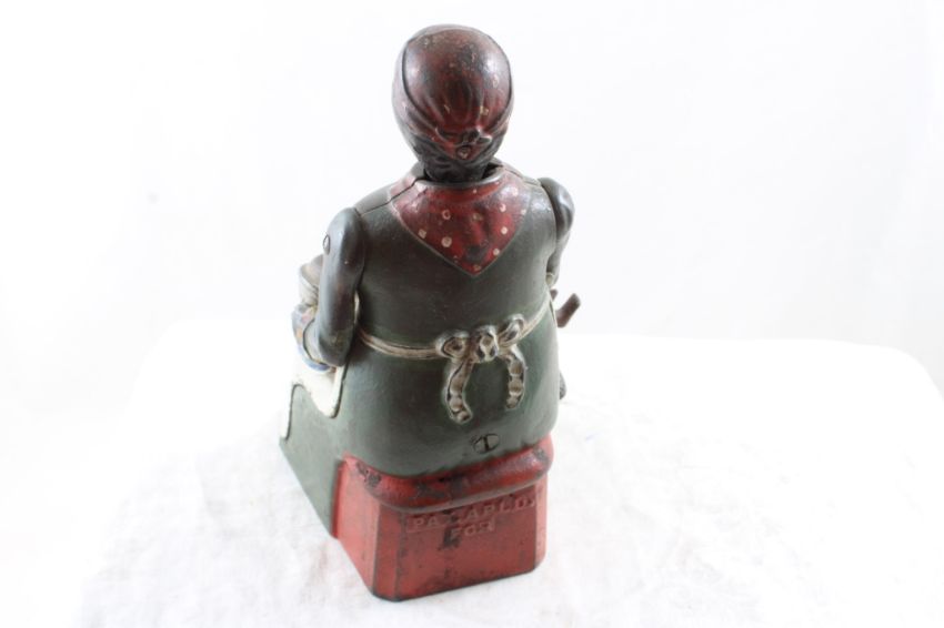 Black Americana Mammy Feeding Baby Mechanical Bank -Antique and being sold for parts or repair. Bottom is missing and perhaps part of the spoon to feed the baby. As pictured. Please ask questions and read terms & conditions before bidding.