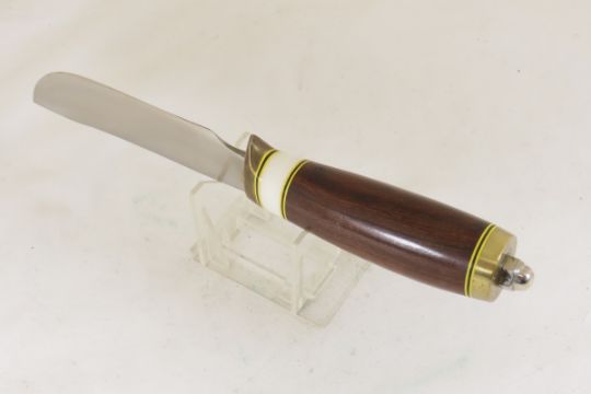 Hand Made Custom Knife by Dr. Robert E Molenaar Steel blade with brass guard & butt, fiber spacers. Dark wood handle, blade measures a little over 4.5 inches. Overall 9 inches, includes custom leather sheath Signed R.E.M. Please ask questions & read terms and conditions before bidding.