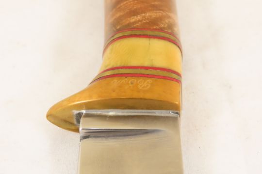 Hand Made Custom Knife by Dr. Robert E Molenaar Steel blade, brass guard & butt with button for keeper strap, wood handle, fiber & brass spacers. Blade measures just over 4 inches, 9.5 inches overall. Signed R.E.M. Please ask questions & read terms and conditions before bidding.