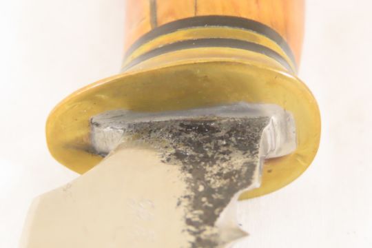 Hand Made Custom Knife by Dr. Robert E Molenaar Steel blade with file work, brass guard, fiber spacers, blade measures 3.25 inches overall 8.25 inches. Signed R.E.M. Please ask questions & read terms and conditions before bidding.
