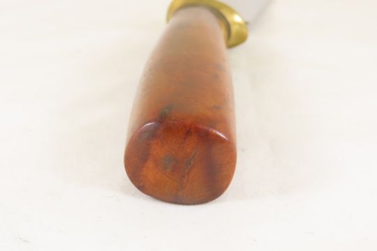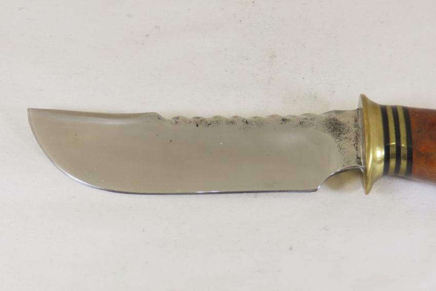 Hand Made Custom Knife by Dr. Robert E Molenaar 5160 steel blade with hand forge patina, brass & fiber fittings. Flared brass finger guard, Madrone handle, blade measures 4.5 inches 9.5 inches overall. Signed R.E.M. Please ask questions & read terms and conditions before bidding.