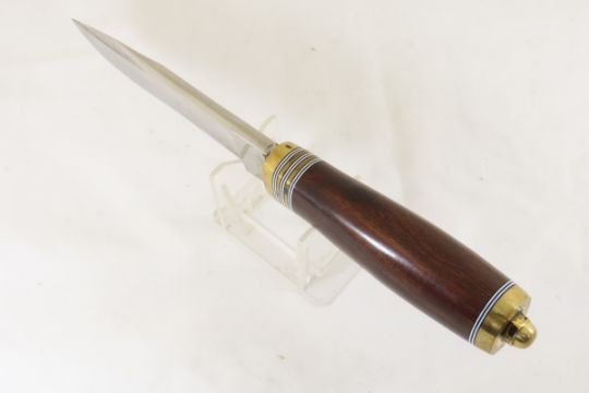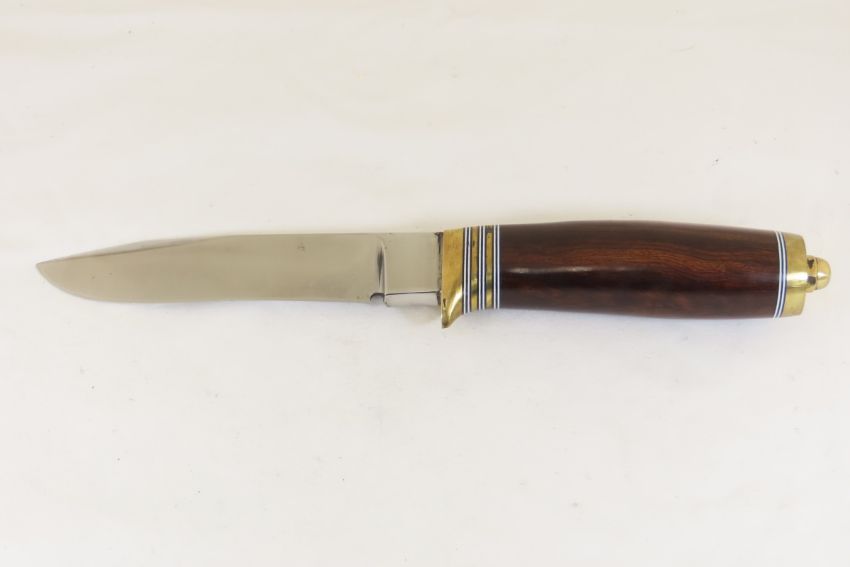 Hand Made Custom Knife by Dr. Robert E Molenaar D2 steel hollow ground blade, brass guard & butt, fiber spacers. Desert ironwood handle, drop point blade measures 5.25 inches 10.25 inches overall. Signed R.E.M. Please ask questions & read terms and conditions before bidding.