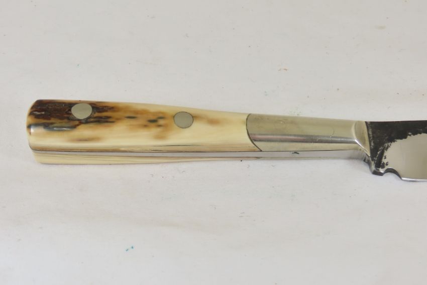 Hand Made Custom Knife by Dr. Robert E Molenaar Steel blade with forge patina, steel & antler handle, blade measures 3.25 inches, 7.75 inches overall, includes custom hand tooled leather sheath Signed R.E.M. Please ask questions & read terms and conditions before bidding.