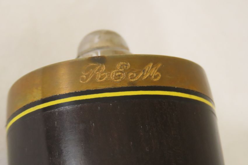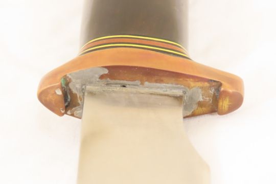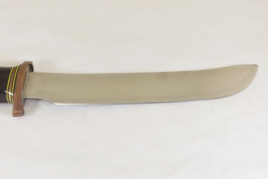 Hand Made Custom Knife by Dr. Robert E Molenaar Steel blade, brass guard & butt, fiber & brass spacer's dark wood. Handle blade measures 8.75 inches, 13.5 inches overall. Signed R.E.M. Please ask questions & read terms and conditions before bidding.