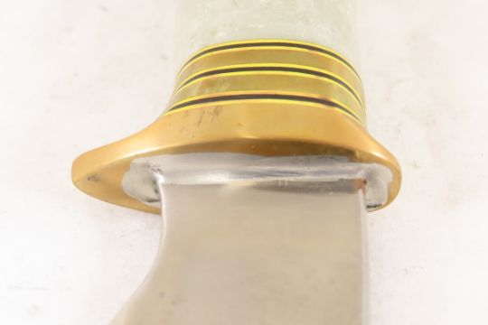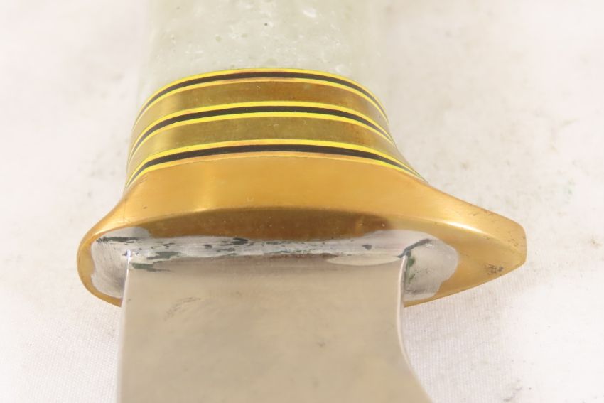 Hand Made Custom Knife by Dr. Robert E Molenaar Steel blade with brass guard & butt, brass & fiber spacers, possibly Stone handle very heavy, blade measures 4.5 inches 9.25 inches overall. Signed R.E.M. Please ask questions & read terms and conditions before bidding.