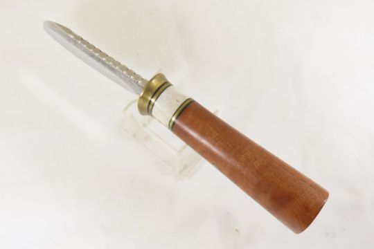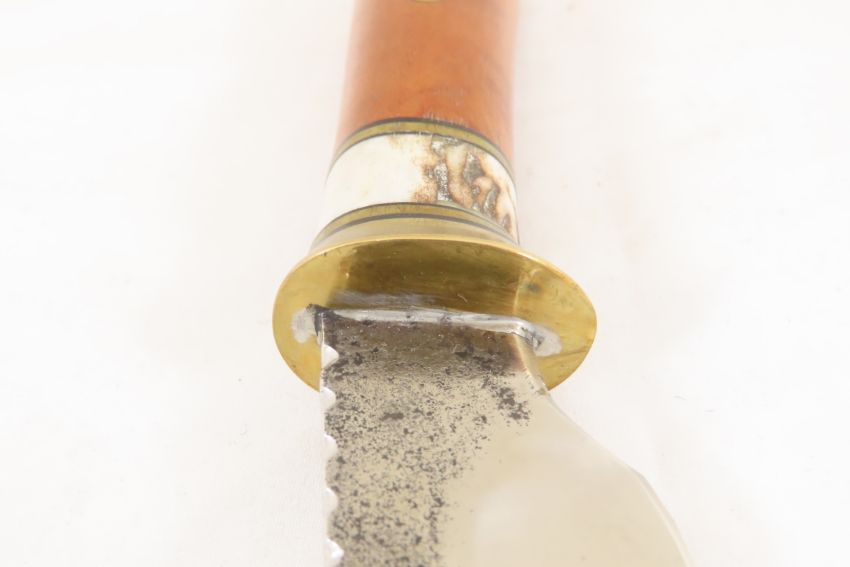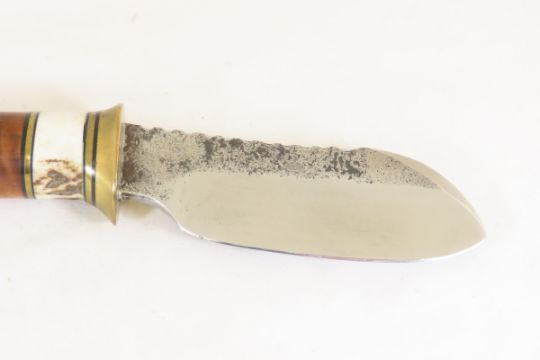 Hand Made Custom Knife by Dr. Robert E Molenaar 5160 drop point steel blade with file work, & forge patina, brass & fiber guard, Madrone Wood handle, blade measures 4.25 inches, 9 inches overall. Signed R.E.M. Please ask questions & read terms and conditions before bidding.